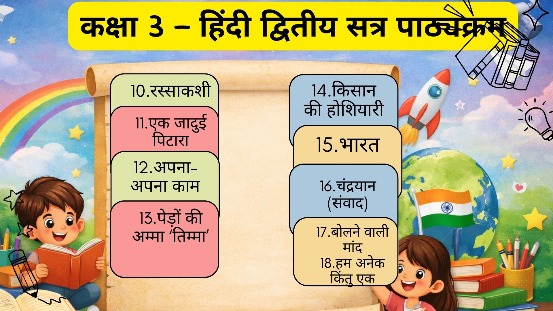 Class 3 Hindi second term syllabus – class 3 students if you are looking for best academic content , then you are at the right place. In this blog, we have explained the complete second term syllabus for Class 3 Hindi as prescribed by EduDel (Delhi Government Schools) and fully aligned with NCERT guidelines, which makes it equally helpful for KVS (Kendriya Vidyalaya Sangathan) students.This syllabus helps students improve their reading, writing, speaking, listening, and creative thinking skills through stories, poems, dialogues, and activities.