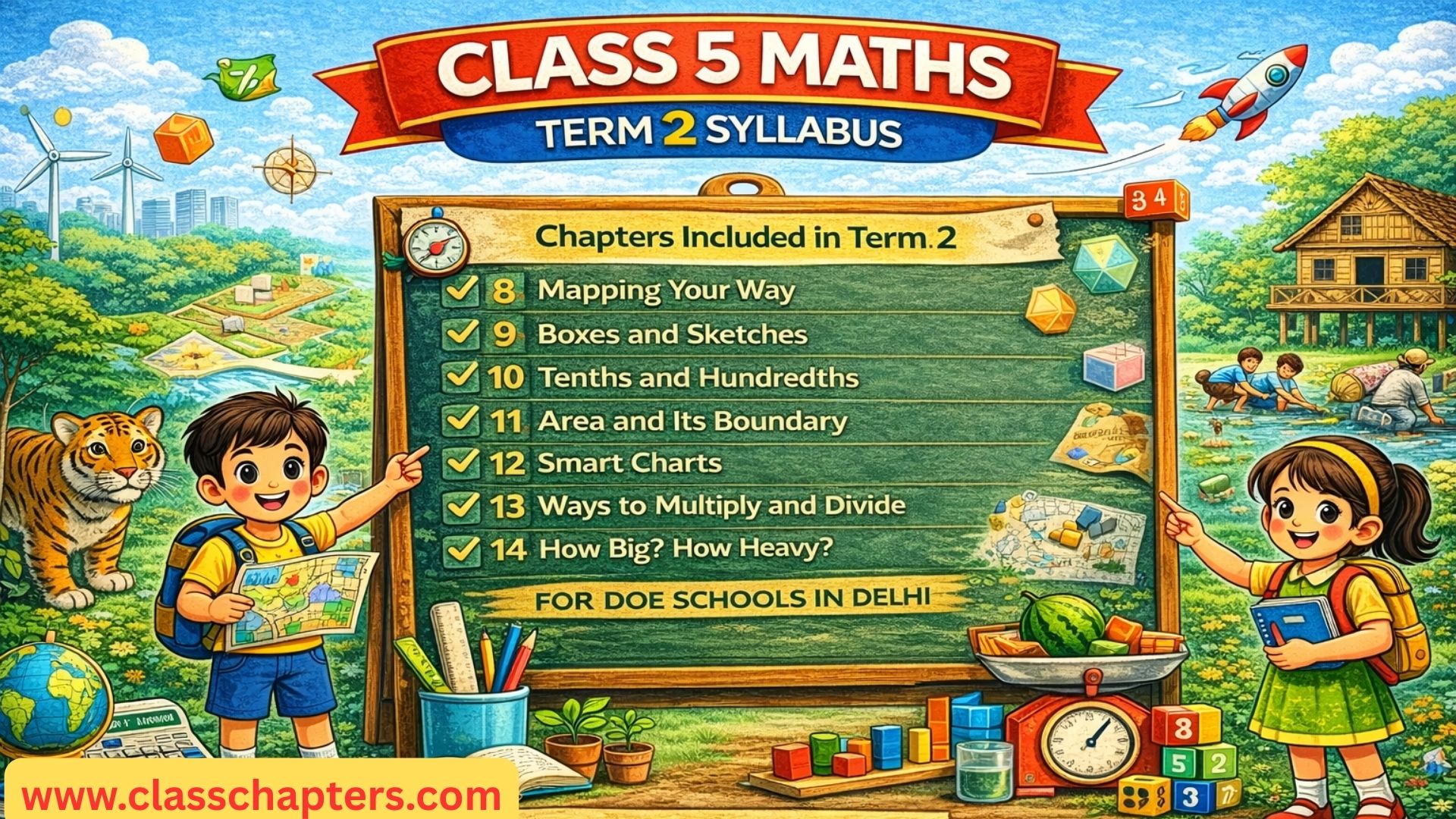 The Term 2 syllabus of Class 5 Mathematics includes seven important chapters – from Chapter 8 to Chapter 14. These lessons help students understand advanced concepts in an easy and activity-based manner.